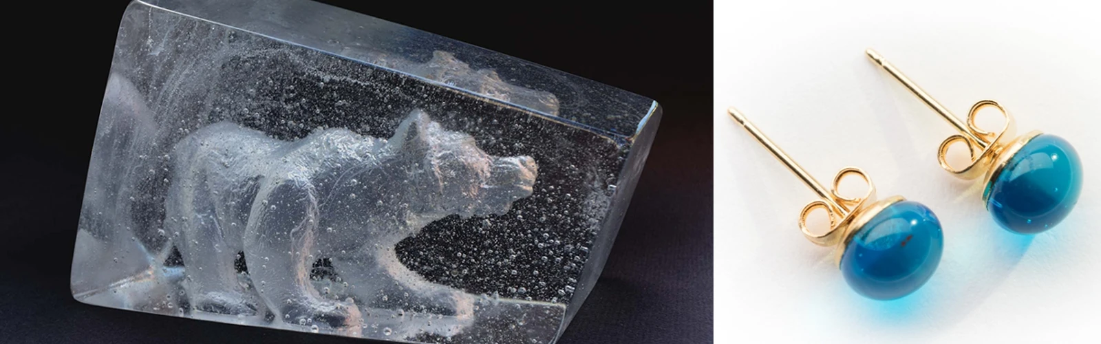 Entre sculpture en pâte de verre, et verre à la flamme, elle réalise des pièces uniques/ ou de petites séries, concevant des bijoux précieux, notamment. Son savoir-faire de gravure et dorure sur verre, lui permette de collaborer avec de prestigieuses maisons de parfums du secteur du luxe, notamment pour des prestations de personnalisation et animations artistiques.